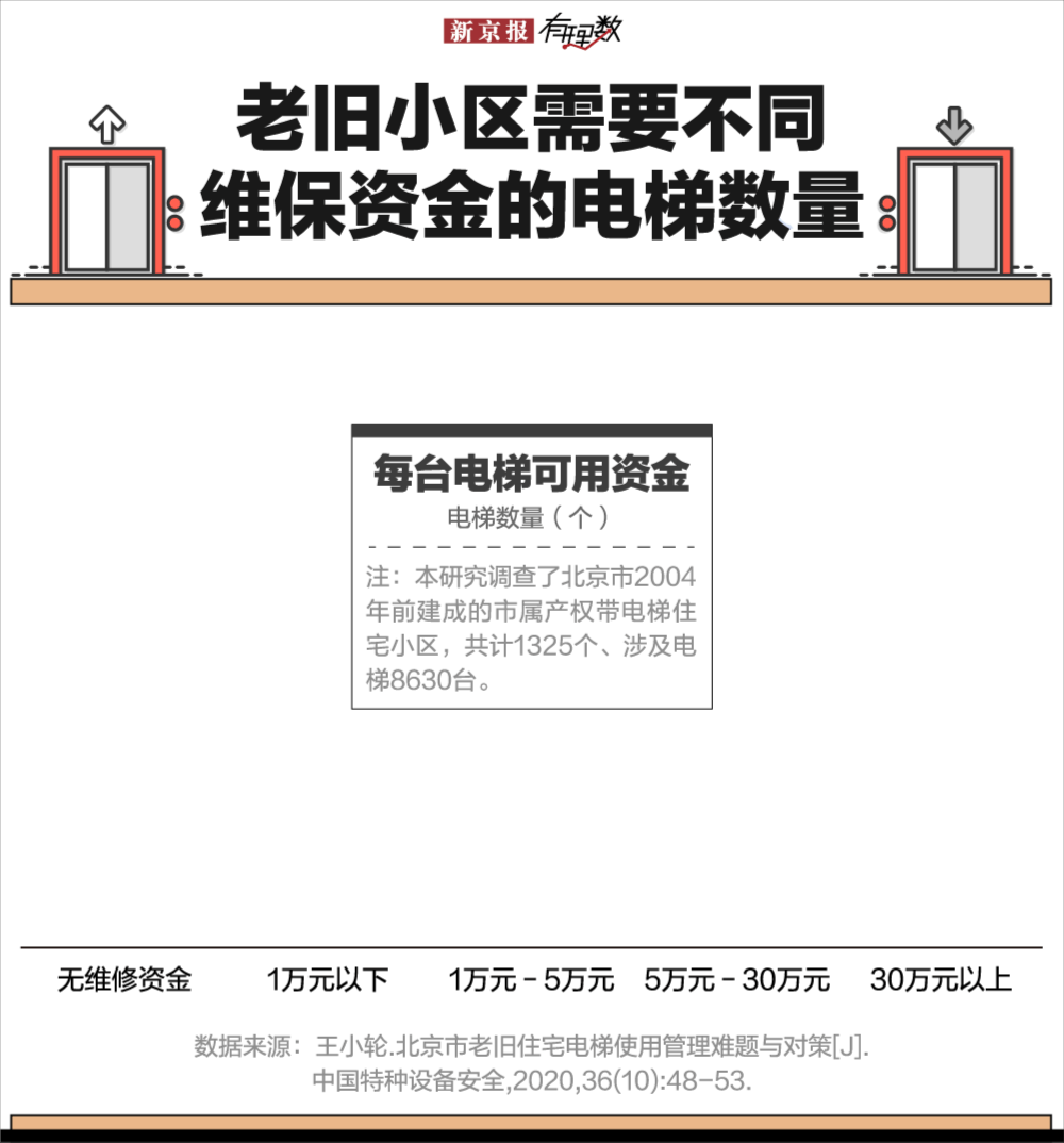 曾经有研究调查统计了北京市1325个老旧住宅小区的资金分配情况,8630台电梯中,无住宅专项维修资金的2477台,涉及441个小区。其中每台电梯可用资金1万元以下的有801台,无维修资金或资金不足的电梯共计3278台。
