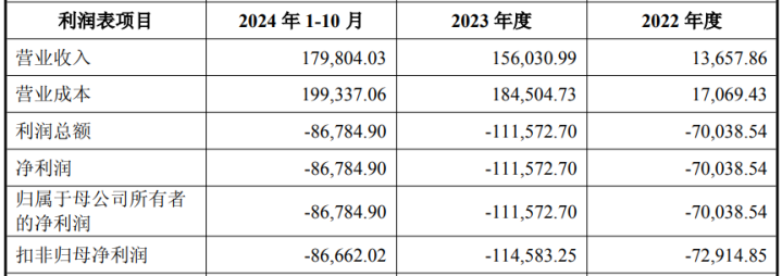 2022年至2024年1-10月,芯联越州的营业收入分别为13,657.86万元、156,030.99万元和179,804.03万元,净利润/归属于母公司所有者的净利润分别为-70,038.54万元、-111,572.70万元和-86,784.90万元,扣非归母净利润分别为-72,914.85万元、-114,583.25万元和-86,662.02万元。